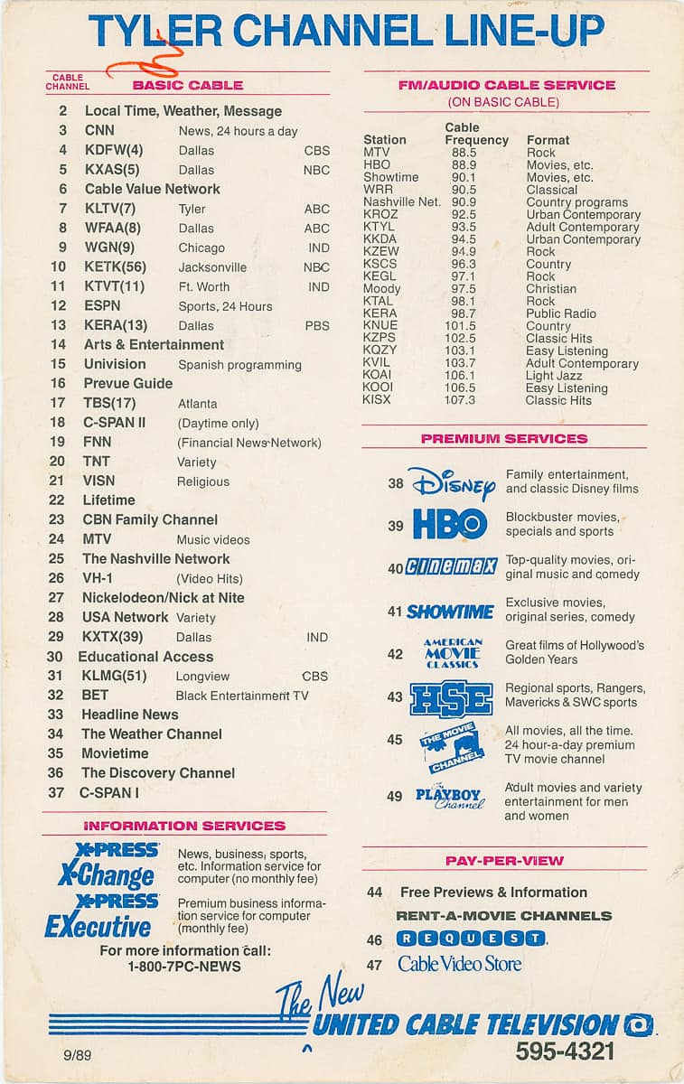 I was rummaging through some old boxes recently and found a cable channel guide from 1989 amongst the other treasures that had been packed away and unseen since the first Bush administration. This particular card was United Cable Television's lineup in the city I grew up in–Tyler, Texas, a somewhat-backwards place in East Texas.