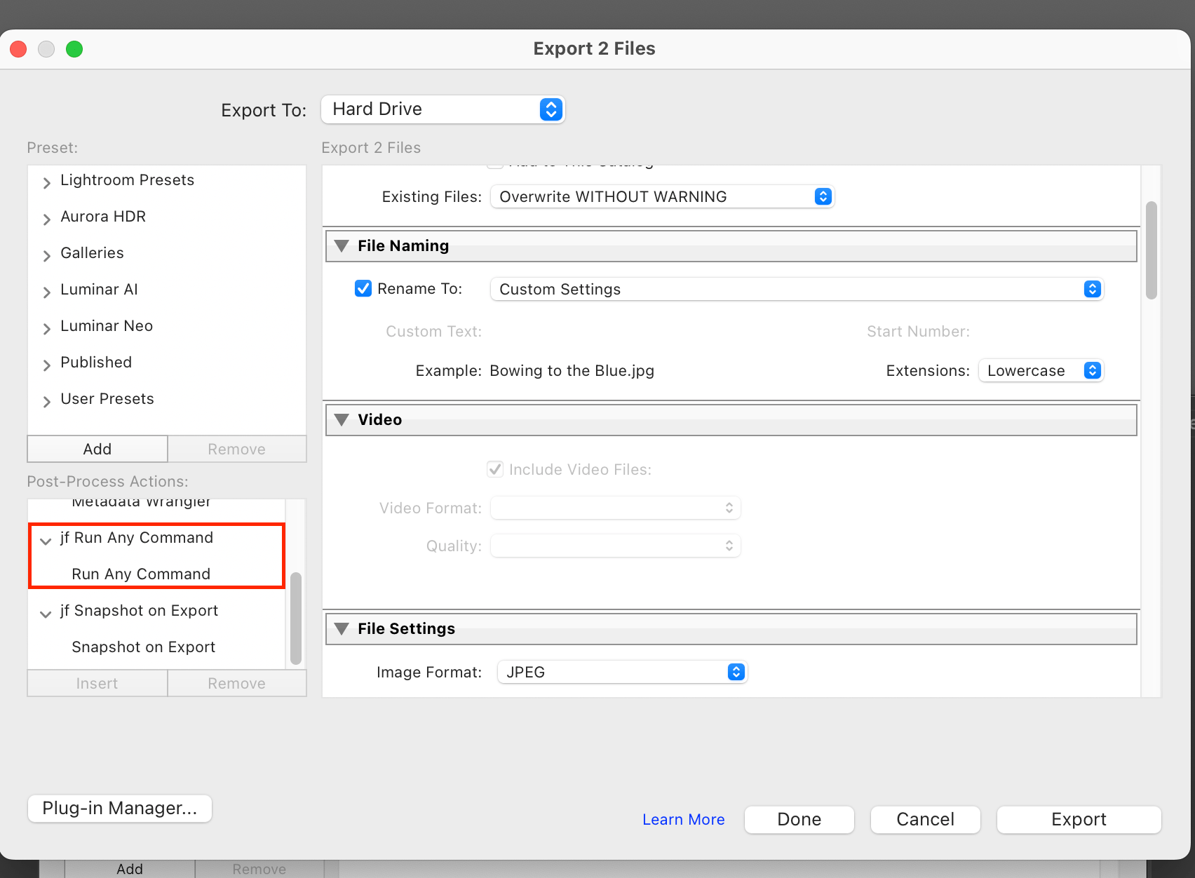 - Configure an export preset with JPEG as the output file, adding "Run Any Command" as a Post-Process Action (the bottom left pane on the export screen):
