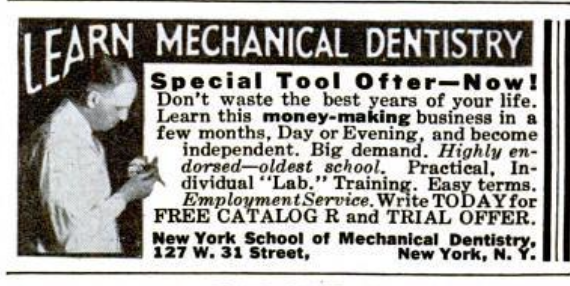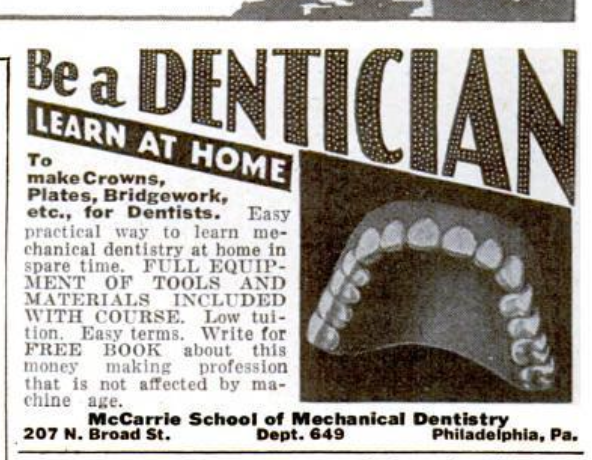 From my vantage point 88 years in the future, I assumed the “Morning After” use for Alka-Seltzer was, in fact, as a prehistoric version of Plan B.“Hey, honey, just got home from a hard day of cuttin’ on people…I’m going to listen to the wireless and file some metal”Bad news, Phil…playing the harmonica isn’t going to make you popular. Also, your school has a harmonica band?Bad news, Phil…playing the harmonica isn’t going to make you popular. Also, your school has a harmonica band?I feel like this is something that should be learned in a clinical setting, but what do I know?Dafuq is “Mechanical Dentistry”?The term “fur work” makes me uncomfortable. Also, this guy looks like he enjoys cutting up animals way too much.The term “fur work” makes me uncomfortable. Also, this guy looks like he enjoys cutting up animals way too much.