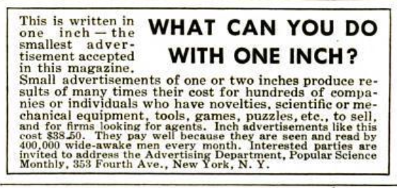 I recently acquired a stash of old Popular Science magazines and, much like old Playboy magazines, they're chock full of weird ads, so I thought I'd share some of the more "interesting" ones. This installment is from the September 1937 issue.